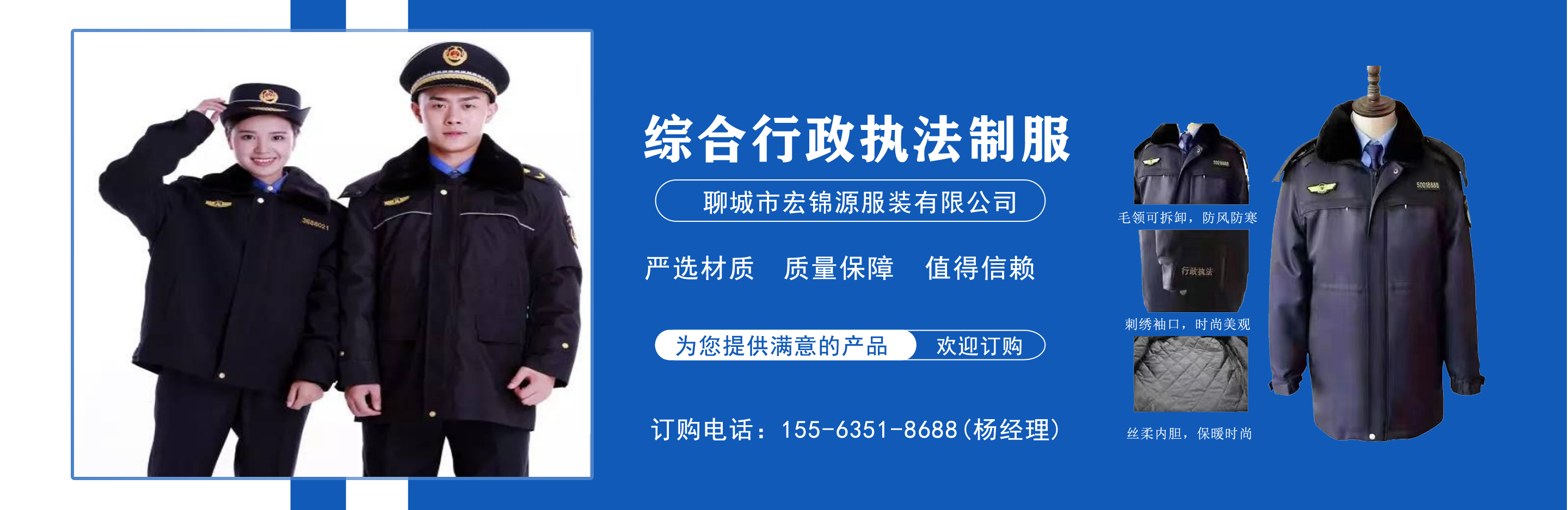 聊城市宏錦源服裝有限公司位于江北水城—山東聊城,地理位置優(yōu)越,交通便利。公司主營(yíng)綜合行政執(zhí)法制服,交通執(zhí)法服裝,應(yīng)急管理執(zhí)法標(biāo)志服,市場(chǎng)監(jiān)督管理標(biāo)志服,農(nóng)業(yè)執(zhí)法服裝,生態(tài)環(huán)境保護(hù)制服,文化市場(chǎng)執(zhí)法服,城管標(biāo)志服裝廠,衛(wèi)生監(jiān)督制服,六部門(mén)標(biāo)志服廠家等,值得信賴! 公司生產(chǎn)的標(biāo)志服裝據(jù)有造型美、板型新、多次水洗不退色、不變型、不起泡。 “認(rèn)真辦事,踏實(shí)做人”是宏錦源的企業(yè)精神,我們的宗旨是:“用服務(wù)與真誠(chéng)來(lái)?yè)Q取你的信任與支持,互惠互利,共創(chuàng)雙贏!”我公司愿與國(guó)內(nèi)外各界同仁志士竭誠(chéng)合作,共創(chuàng)未來(lái)企業(yè)目標(biāo):在已選定的服飾領(lǐng)域中,成為行業(yè)的卓越者。 經(jīng)營(yíng)理念:追求產(chǎn)品卓越,為用戶提供完美、高效的服務(wù)。...